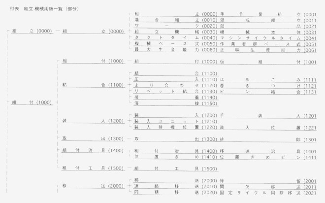 「そうですね、それでは組立機械用語一覧を付表として付けてみましたので、まずそれを一読してみて下さい。これは、精機学会(現、精密工学会)の自動組立専門委員会でまとめたものですが、体系的に一読できるので大変便利です。」